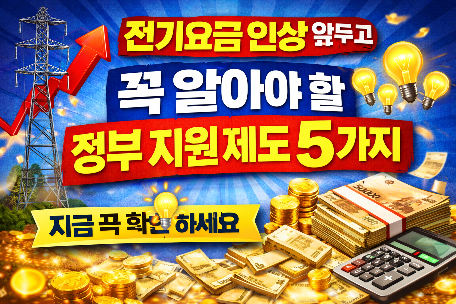 안녕하세요, 필로그스입니다. 요즘 전기요금 고지서 받아보신 분들 많으시죠? 지난해보다 분명히 금액이 더 올라 깜짝 놀라신 분들도 계실 겁니다. 하지만 다행히도 정부에서는 전기요금 부담을 줄이기 위해 **5가지 생활 지원 제도**를 운영 중입니다. 오늘은 그 제도들을 한눈에 정리해드릴게요. 구독자님께서 한 푼이라도 아낄 수 있도록 필로그스가 실전형 정보만 담았습니다.