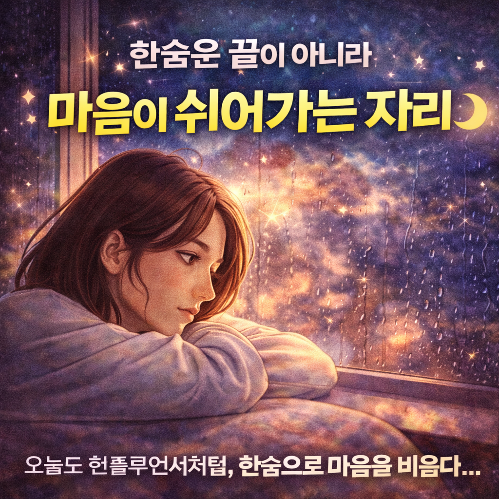 한숨이 깊을수록 마음의 공간은 넓어집니다. 그 안에 오늘의 슬픔도, 내일의 희망도 함께 담을 수 있길 바랍니다. 오늘도 스스로를 다독이는 여러분, 참 멋집니다.