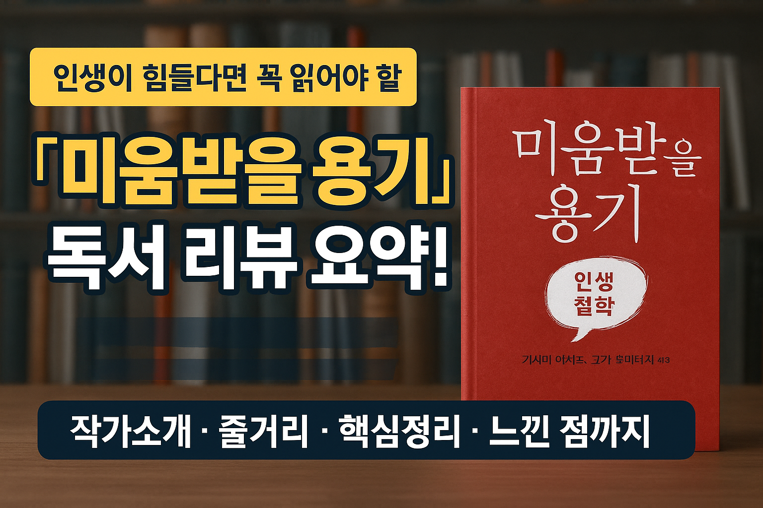 『미움받을 용기』는 일본의 철학자 **기시미 이치로(岸見 一郎)**와 작가이자 심리상담가 **고가 후미타케(古賀 史健)**가 함께 집필한 책으로, 아들러 심리학의 대중화를 이끈 결정적 작품입니다.