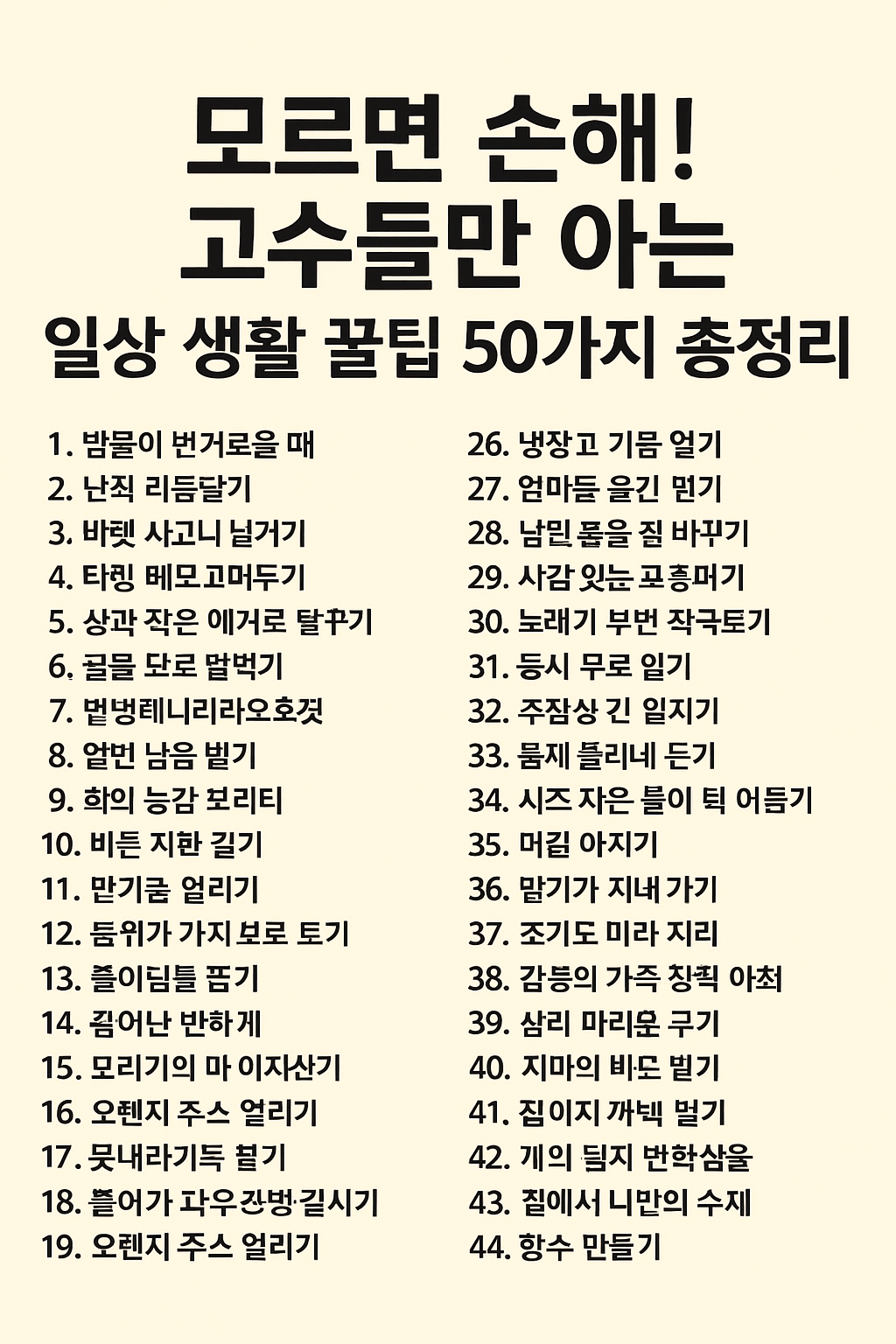 이번 포스팅에서는 실제 생활에서 바로 써먹을 수 있는 ‘리얼 꿀팁’ 50가지를 분야별로 정리했습니다.